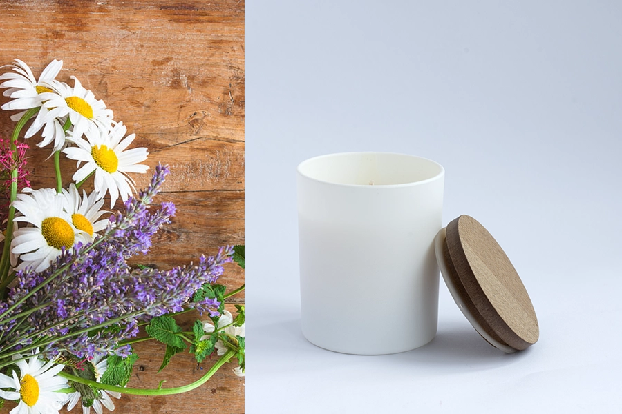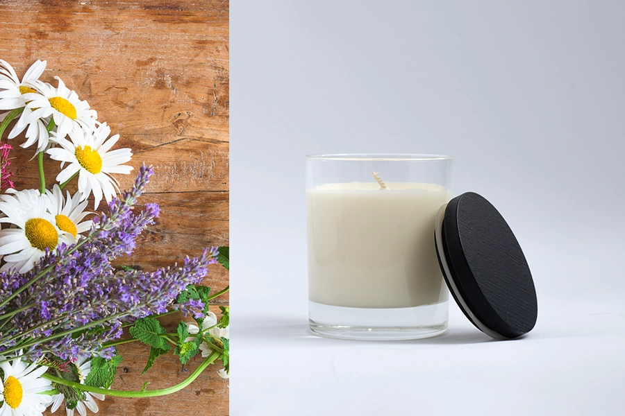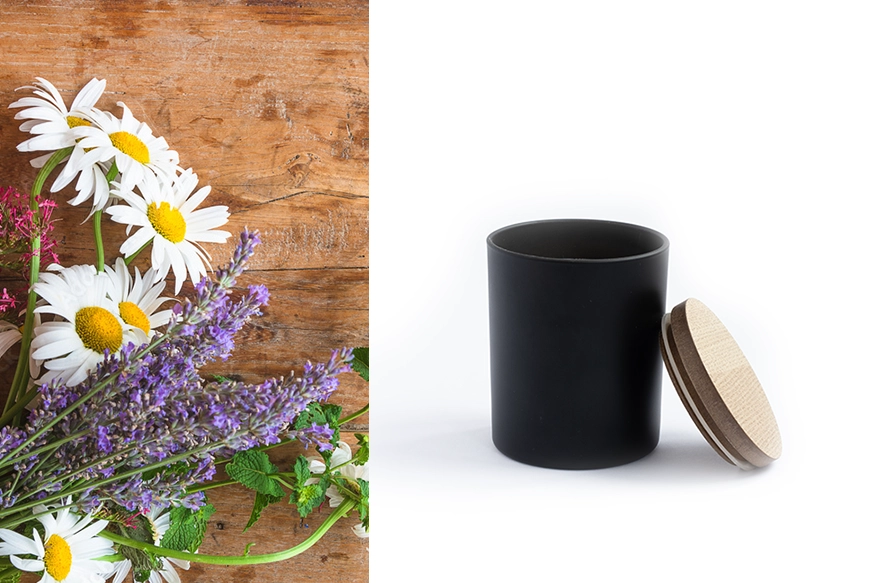 Lumanare parfumata din ceara de soia, turnata manual in straturi, cu fitil de bumbac, intr-un recipient de sticla care se inchide perfect cu un capac din lemn.