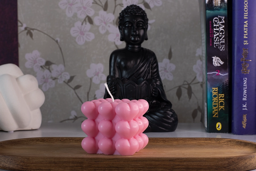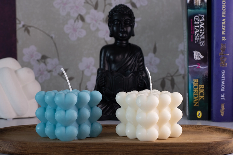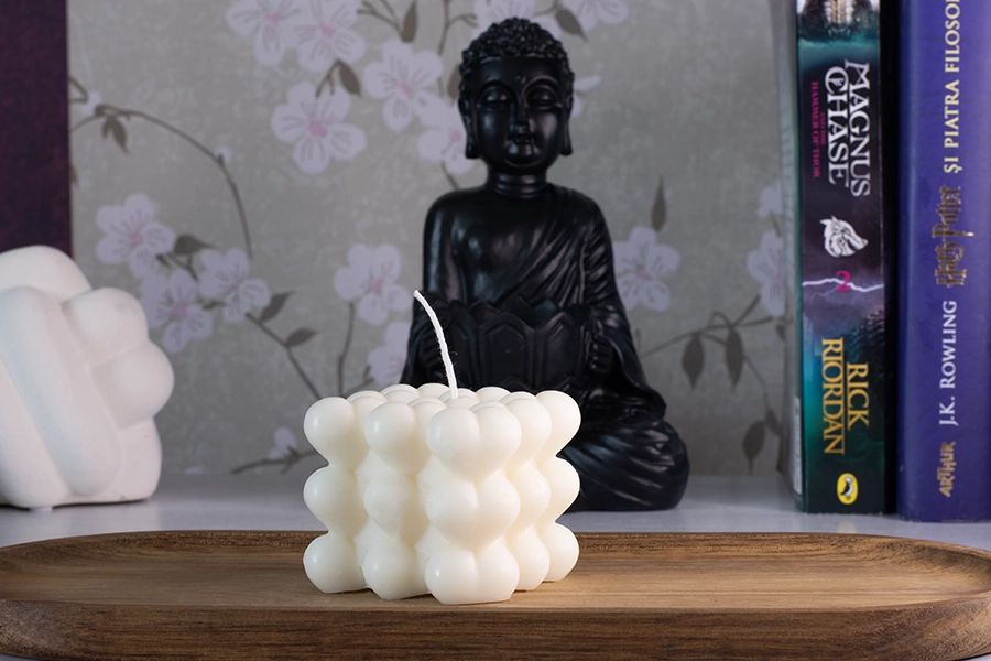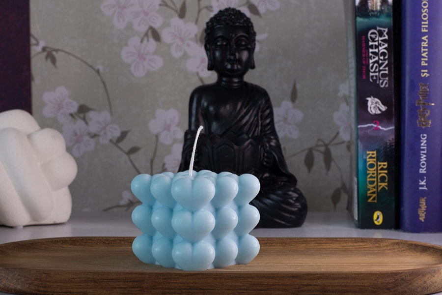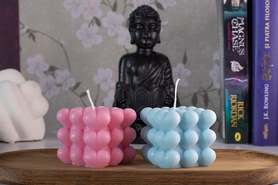 O lumanare unica si “eye-catching”, creata in forma de cub si inimioare pe  toate partile, creand o suprafata unica si texturata. Va completa orice decor ca o piesa sculpturala decorativa eleganta care va accentua interiorul , creand in acelasi timp o ambianta relaxanta atunci cand este aprinsa.